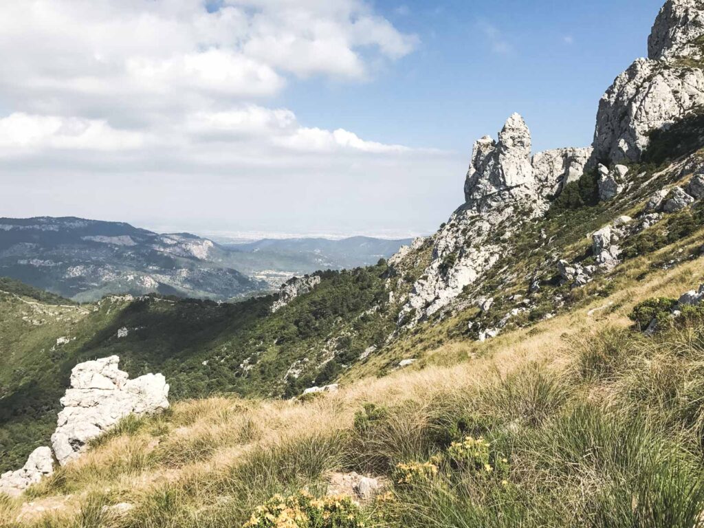 Busfahrt auf die andere Seite des Galatzós nach Puigpunyent, einem kleinen in den Bergen gelegenen Städtchen. Wir wanderten am fünften Tag zunächst zu einer herrschaftlichen Finca. Hier gab es mittags ein landestypisches Picknick und eine längere Rast. Der Weg zur Finca war echt anstrengend, es ging bergauf, bergab. Einige aus unserer Gruppe nutzten das Angebot mit dem Jeep zurück gebracht zu werden. Der Rest und wir beide machten uns wieder zu Fuß auf den beschwerlichen Weg zurück. Am Fuß des Galatzós teilte sich die Gruppe noch weiter. Fünf Wanderer, unter anderem ich wollten noch den Gipfel erklimmen. Petra fühlte sich schon etwas kaputt und ging mit den übrigen und der Wanderführerin um den Berg zurück zum Hotel nach Estellencs. Oben angekommen konnten wir die Ausblicke auf die Westküste und die Ebene von Palma genießen.