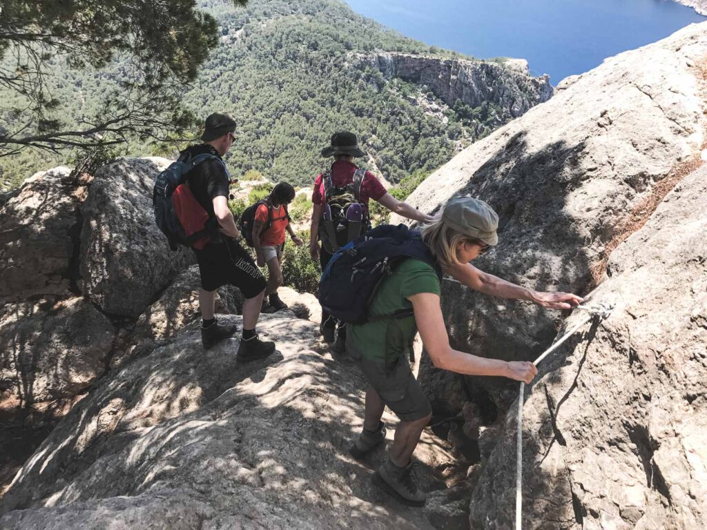 Am letzten Tag, dem sechsten, hatten wir eine Wanderung in etwas offenerem Gelände mit grandiosen Ausblicken auf das Meer und die Dracheninsel. Wir wanderten oberhalb von Andratx vom Coll de Sa Gramola auf einem technisch einfachen Höhenweg, der durch Macchia und Zistrosen Felder zur Klosterruine Sa Trapa führt. Nach dem anschließenden anspruchsvollen Abstieg nach San Telmo hatten wir uns eine Pause am Strand verdient. Zurück ging es wieder per Bus.