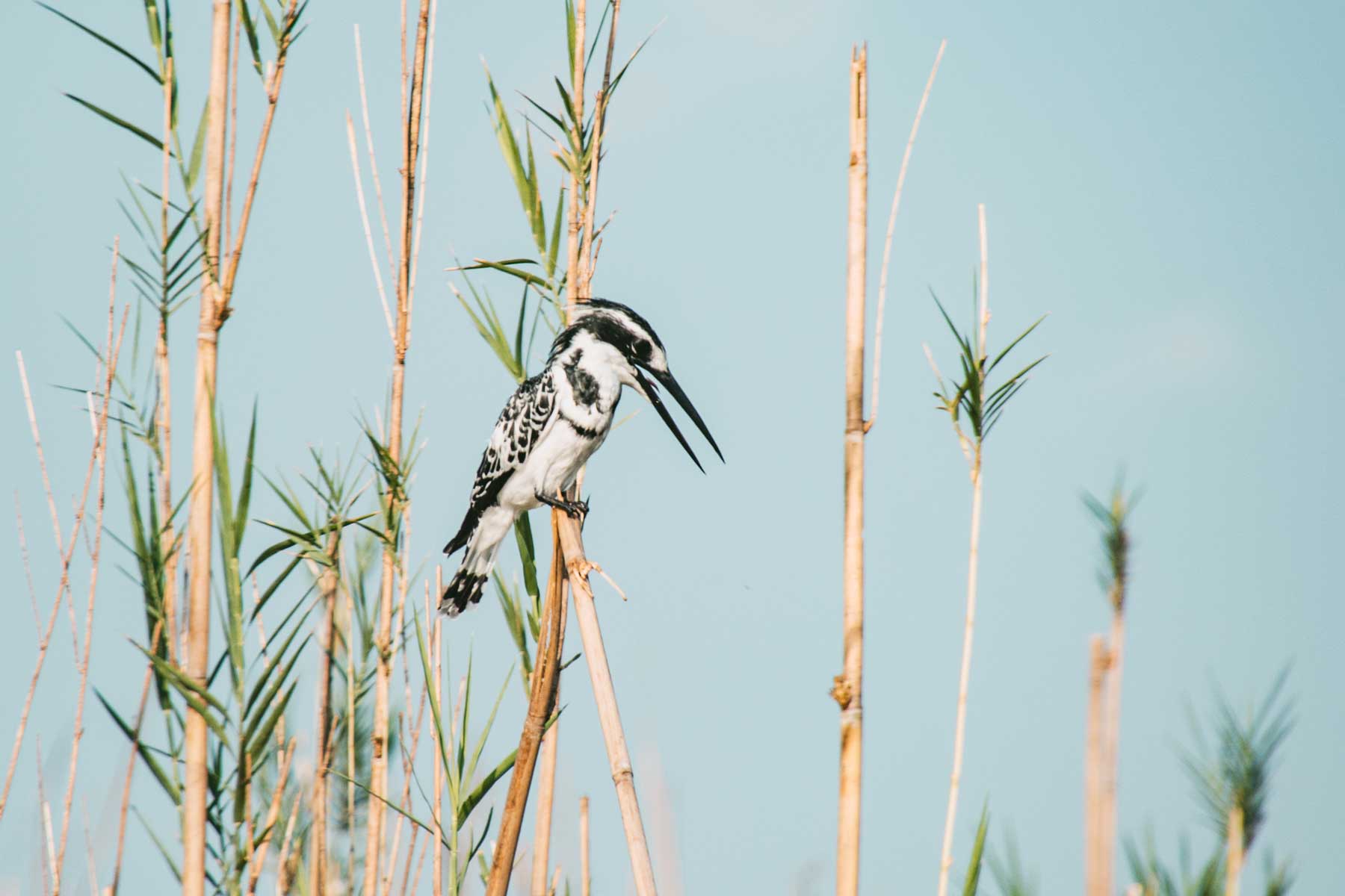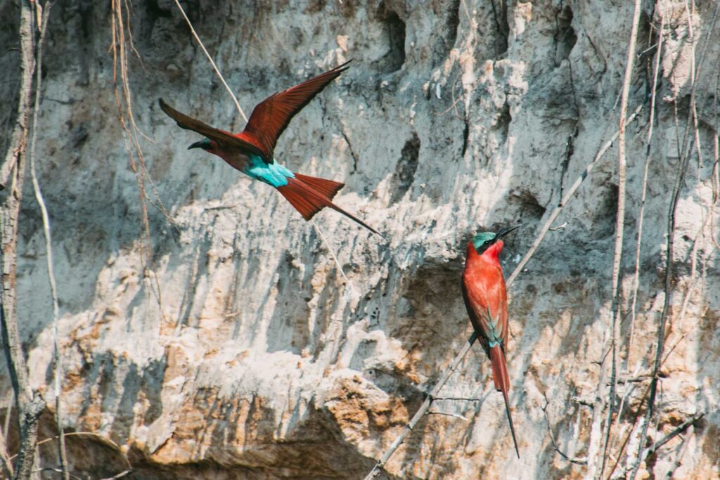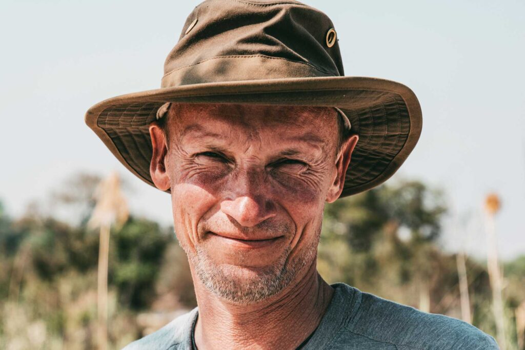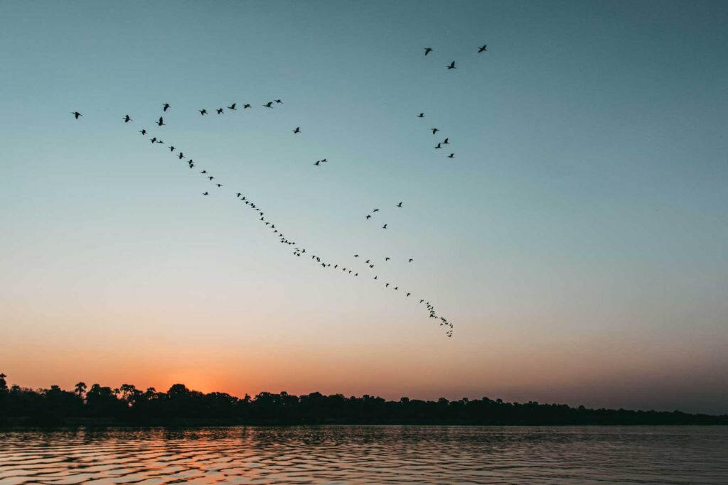 Okawango – Hinter Grootfontein passierten wir die »Rote Linie«, einen Veterinärzaun, der quer durch Namibia verläuft. Hier ändert sich das Landschaftsbild schlagartig von der für Namibia typischen unbewohnten Weite zu einem dichter besiedelten Gebiet mit vielen kleinen Dörfern sowie hohen Bäumen und Palmen. Auf der Weiterfahrt kommen wir an Rundu vorbei. Die zweitgrößte Stadt des Landes liegt am mächtigen Okawango, der eine natürliche Grenze zu Angola bildet. In der Nunda River Lodge, direkt am Fluss verbrachte die Reisegruppe die Nacht mit Blick auf die weite Flusslandschaft und die grunzende Abendunterhaltung der Flusspferde. Hier stand eine Bootsfahrt zu den Stromschnellen der Popafälle auf dem Programm.