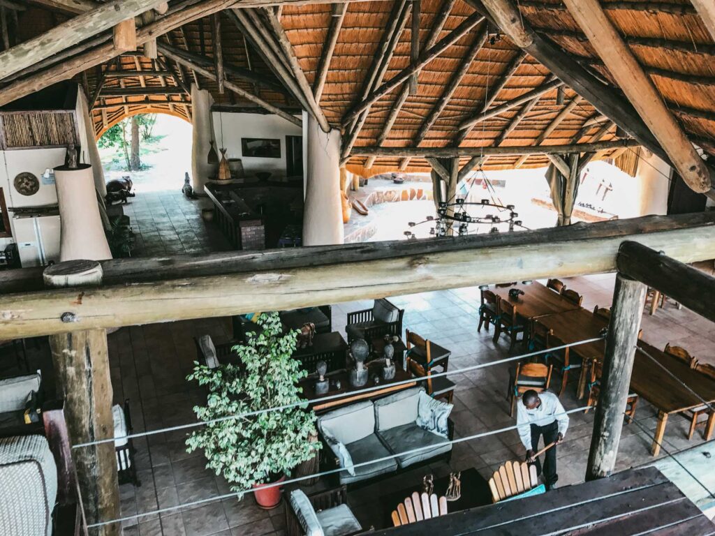 Mudumu-Nationalpark – Weiter ging es durch den wasserreichen Caprivi-Zipfel bis zum Mudumu-Nationalpark. Der Nationalpark wird im Westen durch den Kwando, Grenzfluss zu Botswana, begrenzt. Der Park ist ca. 1000 km² groß und hat für Namibia teilweise eine sehr ungewöhnliche Landschaf: Flussläufe, Reetinseln und Marschen. Die Lianshulu Lodge, mitten im Herzen des Mudumu National Parks, liegt direkt am Ufer des Kwando River. In geräumigen, riedgedeckten Chalets mit Blick auf den Fluss fand wir für die nächsten Tage Platz. Die Lodge verfügte über einen weitläufigen Loungebereich mit Restaurant, Bar, offenem Kamin und Aussichtsdeck, das zum Verweilen einlud.