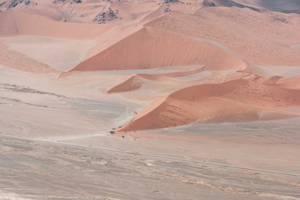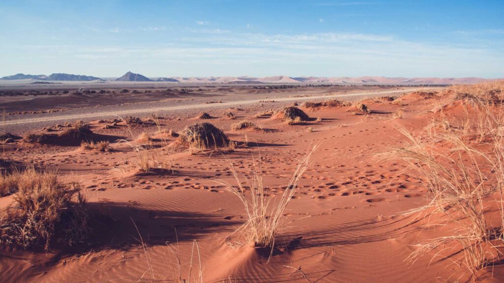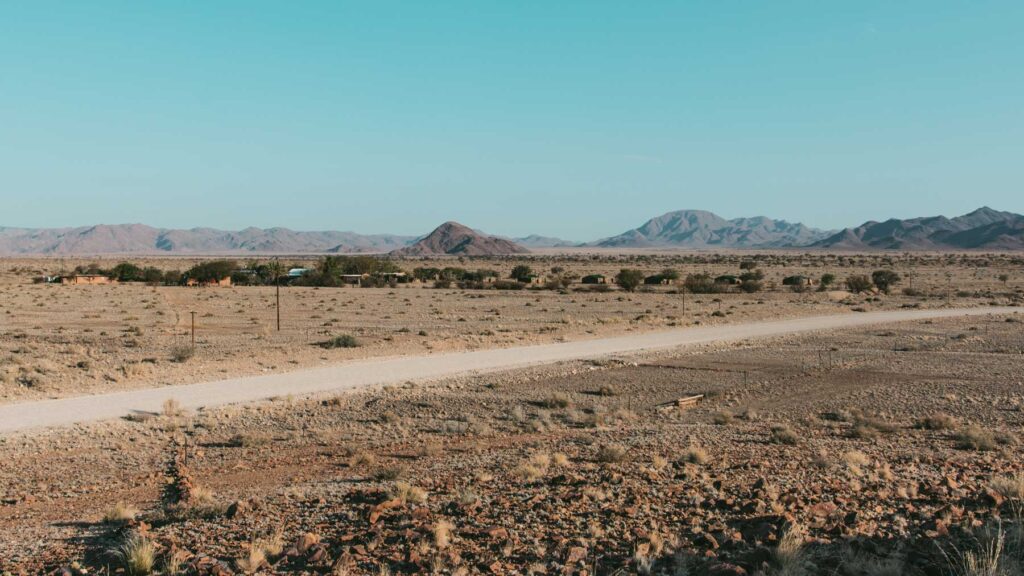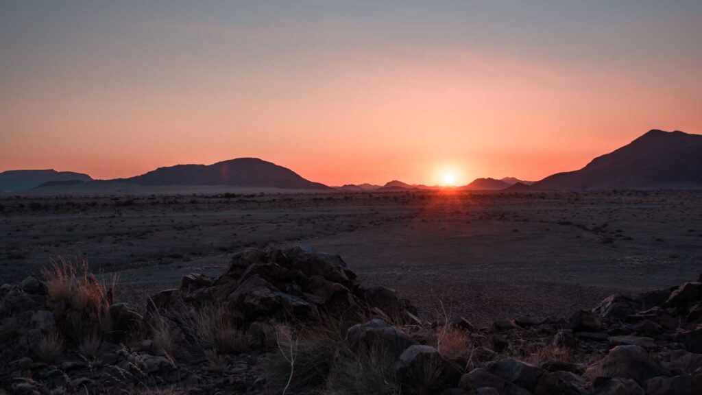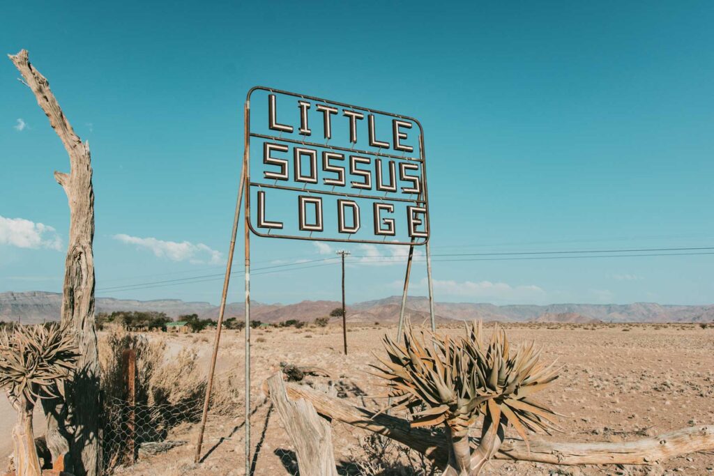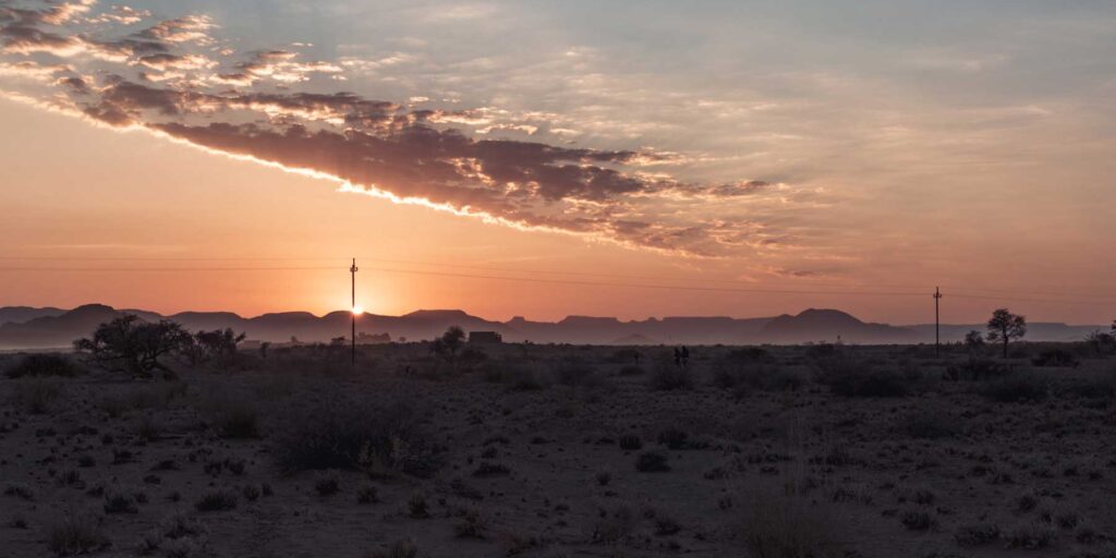 Naukluft-Berge – Die Berge liegen am Ostrand der Namib auf der Höhe von Sesriem und erheben sich durchschnittlich 1000 Meter über das Vorland, von wo aus sie als geschlossene Front erkennbar sind. Die höchsten Gipfel des Massivs liegen bei knapp 2000 m. 95% der Straßen in Namibia sind Staubpisten, dem entsprechend muß man ständig mit Bodenwellen und Schlaglöchern rechnen. Unser Fahrer und Guide erklärte uns während der Fahrt und bei Stops viel über die Geschichte und Natur Namibias. Angekommen in der „Little Sossus Lodge“, gefühlt mitten im Nirgendwo, gab es bei einem romantischen Sonnenuntergang einen „Sundowner“, frisch gemixt, auf einer Anhöhe zwischen den Felsen.