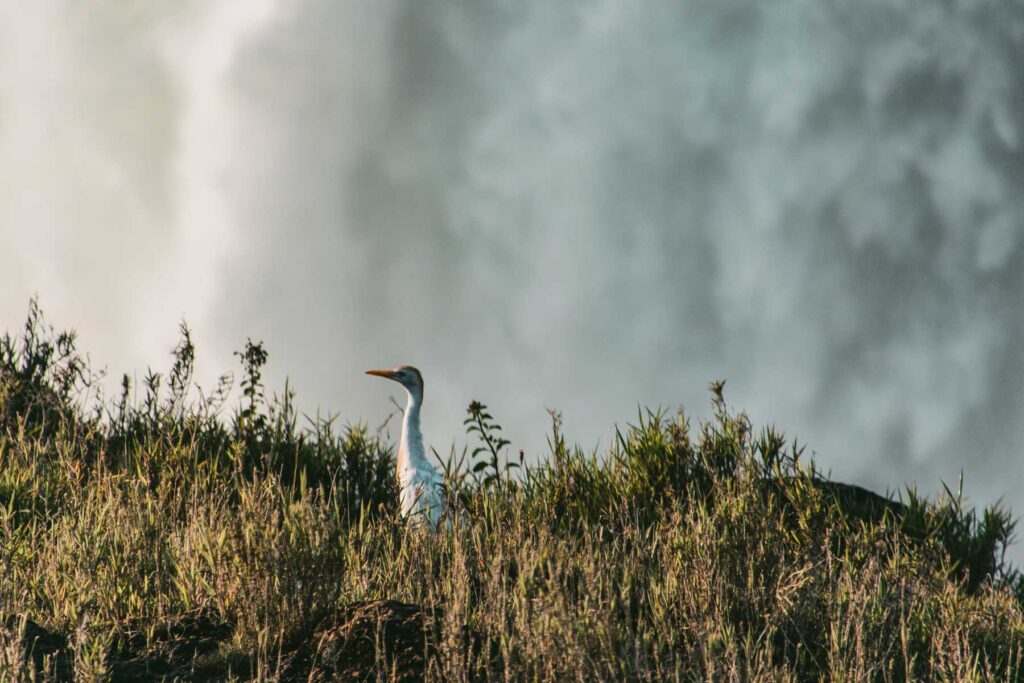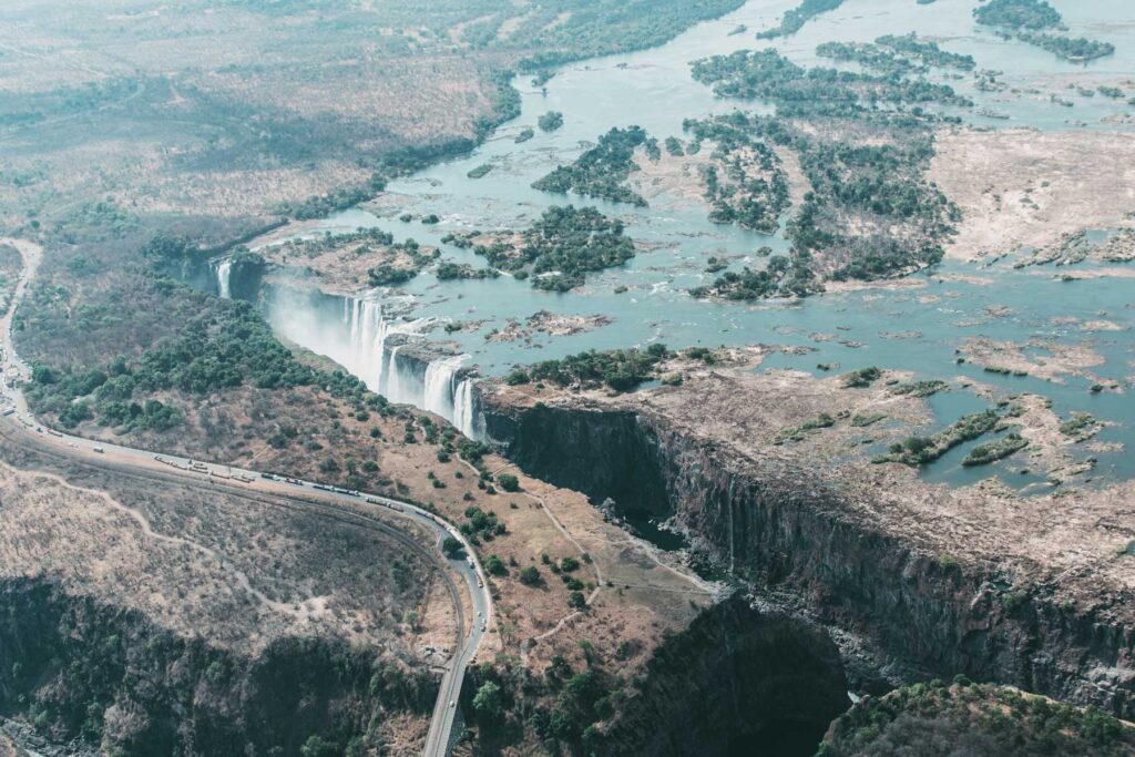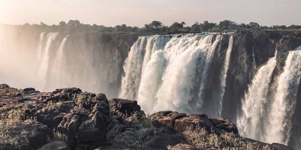 Victoria-Falls – Heute erwartete uns das letzte Highlight unserer Reise. Wir besuchten die berühmten Victoria-Falls und staunten, wie der Sambesi sich mit tosendem Lärm über 100 Meter in die Tiefe stürzt. Wir nahmen uns für den Spaziergang auf dem Rundwanderweg ausgiebig Zeit, denn dort eröffneten sich immer wieder neue Perspektiven und Fotomotive. Der Wasser-Sprühnebel steigt in der regenreicheren Zeit bis zu 200 Meter in die Höhe und ist noch in weiter Entfernung zu sehen, weshalb die Wasserfälle von den Einheimischen »Mosi-oa-Tunya« genannt werden, was so viel wie »donnernder Rauch« bedeutet. Das UNESCO-Weltnaturerbe ist umgeben von tropischem Regenwald – ein wahres Naturparadies, das durch die Feuchtigkeit der immerwährenden Gischt existieren kann. Leider fühlen sich auch die Moskitos hier sehr wohl, meine Beine waren übersät mit Stichen.