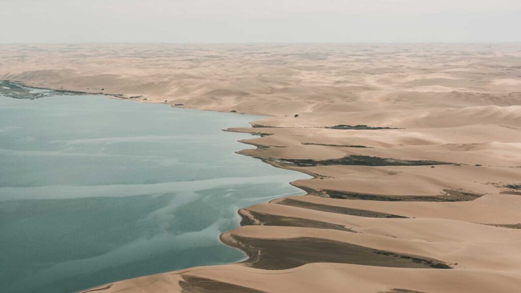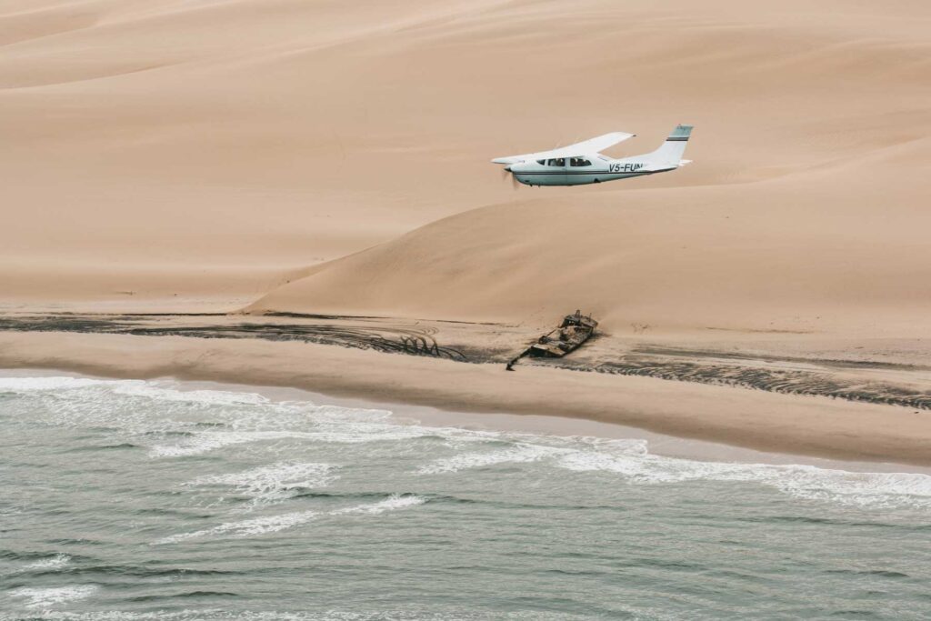 Flug Swakopmund – Sand und Meer, Kontraste pur! Mit zwei kleinen einmotorigen Flugzeugen flogen wir über die älteste Wüste der Welt an die Atlantikküste. Wir sahen die verlassenen Diamantenfelder, Robbenkolonien und die Gerippe von gestrandeten Schiffen. Walvis Bay, der größte Hafen Namibias wurde passiert und wir landeten schließlich in der Küstenstadt Swakopmund. War schon ganz schön schaukelig in so einer kleinen Maschine.