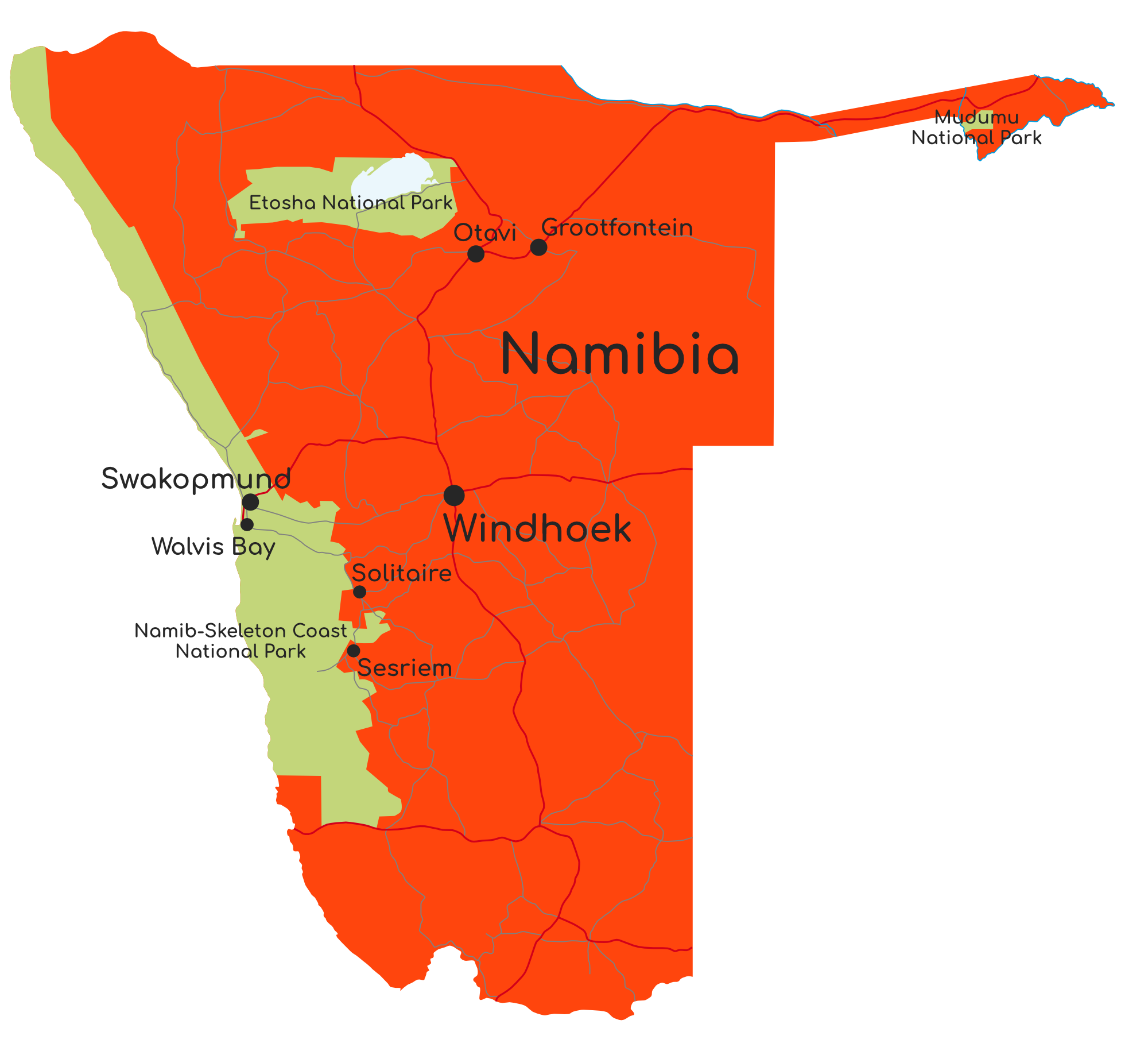 Nachdem wir mit „Chamäleon“ gute Erfahrungen gemacht hatten, ging es wieder mit diesem Reiseanbieter in ein entferntes Land. Knapp drei Wochen Namibia, mit einem kurzen Abstecher nach Botswana in den Chobe-Nationalpark und nach Simbabwe zu den Victoria-Falls lagen vor uns. Über Johannesburg flogen wir nach Windhoek.