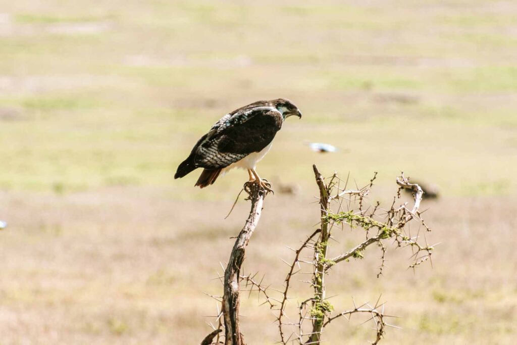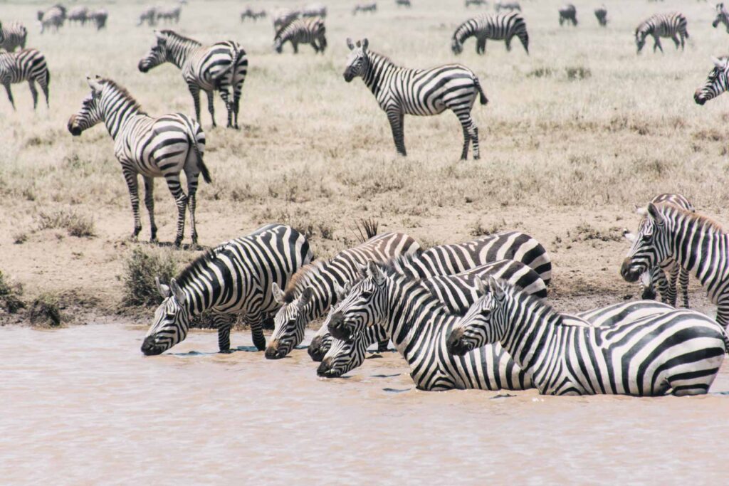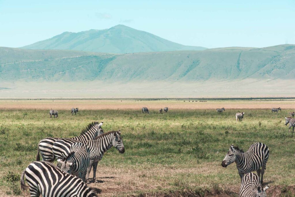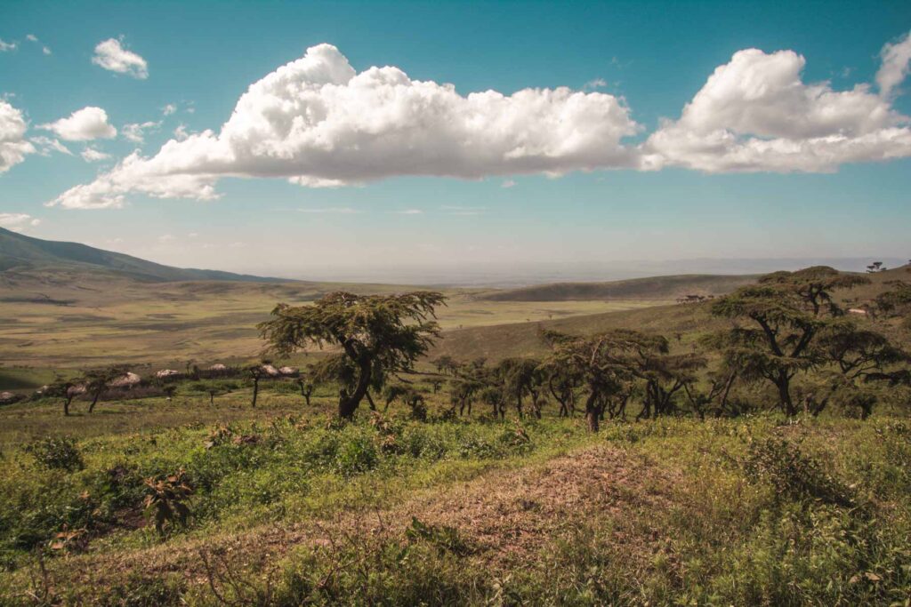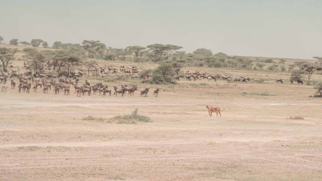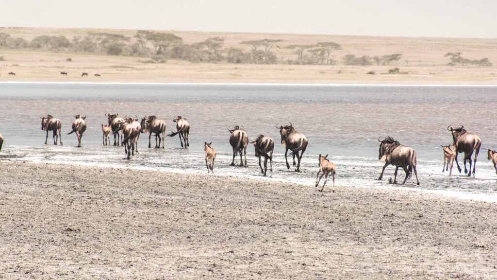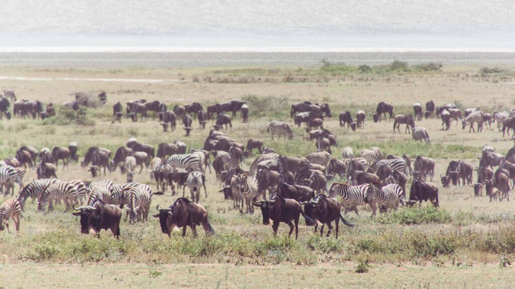 Im Januar-Februar findet die größte Tierwanderung der Welt in der südöstlichen Serengeti der Ndutu Area statt. Ca. 2,5 Millionen Gnus, Zebras und Gazellen ziehen auf der Suche nach frischem Gras durch die Serengeti. Wir begleiteten einige Zeit die Herden und fuhren dann zum Ngorongoro Krater, wo auf dem Kraterand unser Lodge für die Nacht thronte.