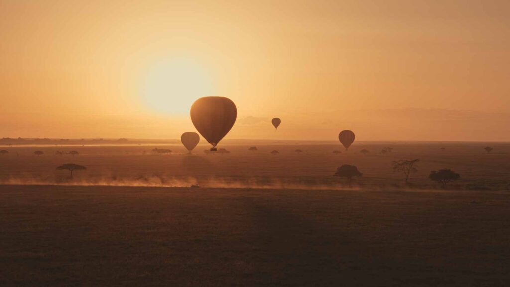 Ganz früh morgens, noch im Dunkeln, wurden wir geweckt, denn es ging zum Ballonfahren bei Sonnenaufgang. Spannend war der Start, der Korb lag auf der Seite und man saß wie ein Astronaut beim Raketenstart 90º gedreht in Position. Leider ist das Anfeuern der Heizflamme immer so laut, daß man nicht so viele Tiere sah. Aber sonst glitt man friedlich und ruhig über die Savanne im Morgenlicht.