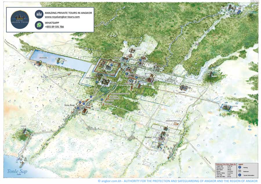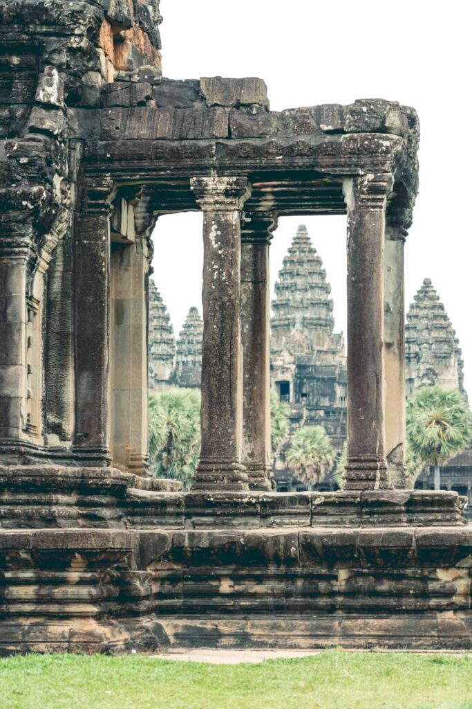 Umgeben wird Angkor Wat von einem 190m breiten Wassergraben, auf dem zu seiner Zeit die Sandsteine zur Erbauung transportiert wurden. Innerhalb des Grabens befinden sich drei rechteckige Galerien, welche sich übereinander erheben. Im Zentrum des Baus befinden sich fünf Türme, die als Quincunx (wie die Punkte auf einem Würfel bei einer Fünf) angeordnet sind. Man geht davon aus, dass kurz nach dem Tod des Königs die Arbeiten am Tempel eingestellt wurden und deswegen viele Reliefs unvollendet blieben. Davon abgesehen hat der Zahn der Zeit am Tempel genagt und er weist heute zahlreiche Schäden auf. Verursacht durch die Witterung, tropische Vegetation und menschlicher Zerstörungskraft, wie z.B. Plünderungen. Aber auch ein religiöser Wandel der Khmer hin zum Buddhismus sorgte dafür, dass der Tempel über Jahrzehnte vernachlässigt wurde. Heutzutage finden Restaurierungsarbeiten statt, um einen weiteren Zerfall zu verhindern. Somit sieht man Angkot Wat selten ohne Baugerüste.