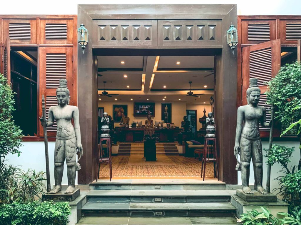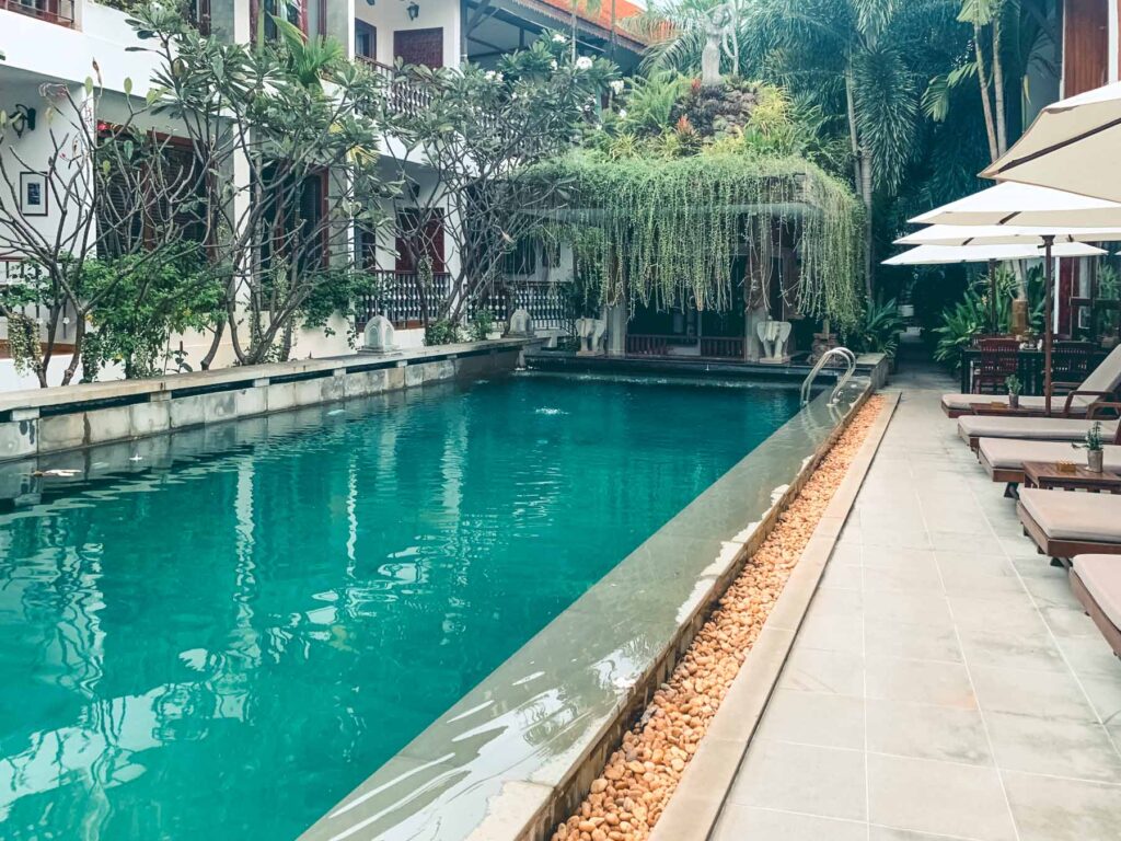 Siem Reap – in Kambodscha war das nächste Ziel, um das nahe gelegene Angkor mit seinen vielen Tempelruinen zu bestaunen. Am Flughafen empfing uns unsere kambodschanische Reiseleitung und brachte uns in unser Hotel. Zum Montra Niesha gehört eine dschungelartige Gartenlandschaft mit zwei Pools und ein Restaurant mit authentischer Khmer-Küche. Da wir gelesen hatten, dass der Standart in kambodschanischen Hotels nicht „so hoch“ sein sollte, waren wir echt überrascht wie klasse das Hotel, sein Service und sein Essen waren.