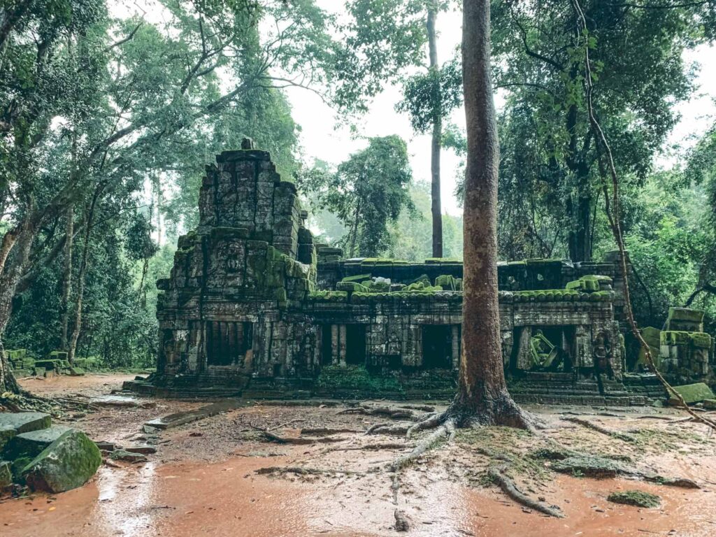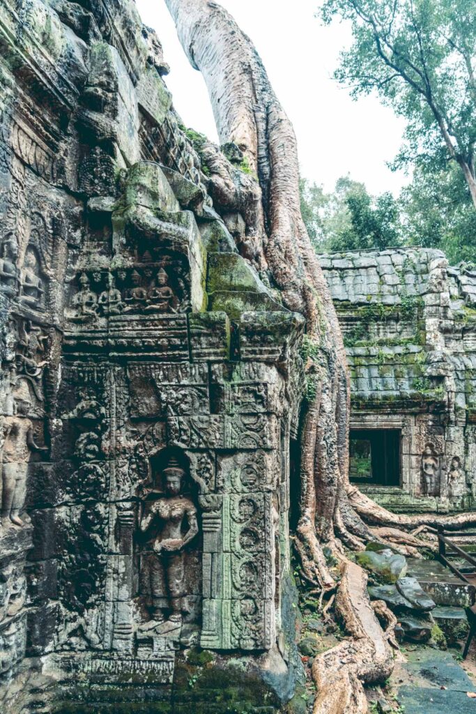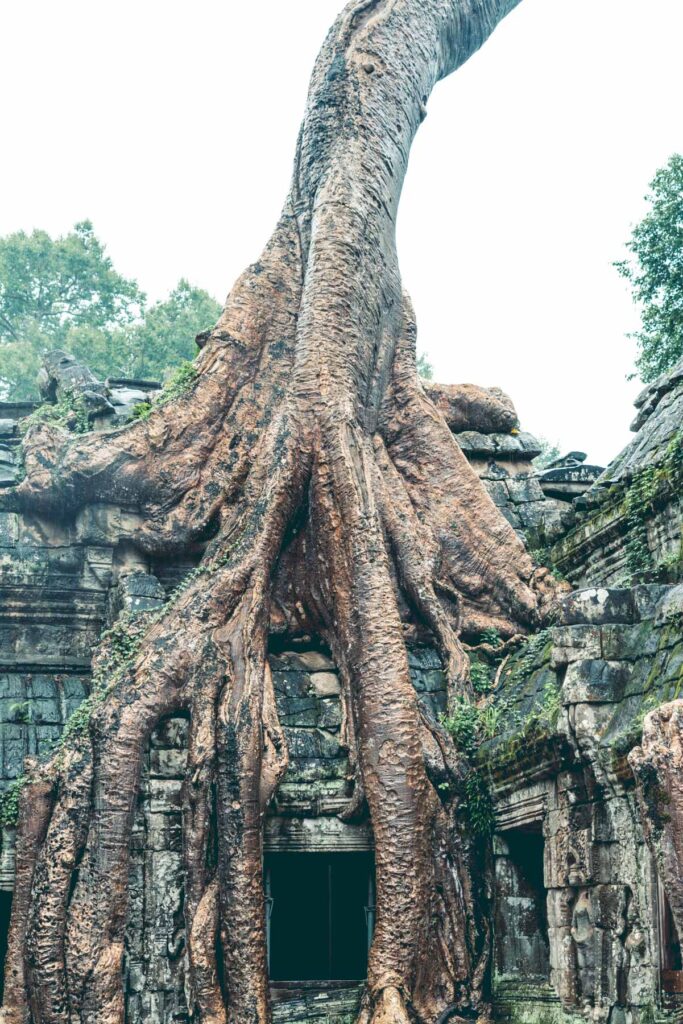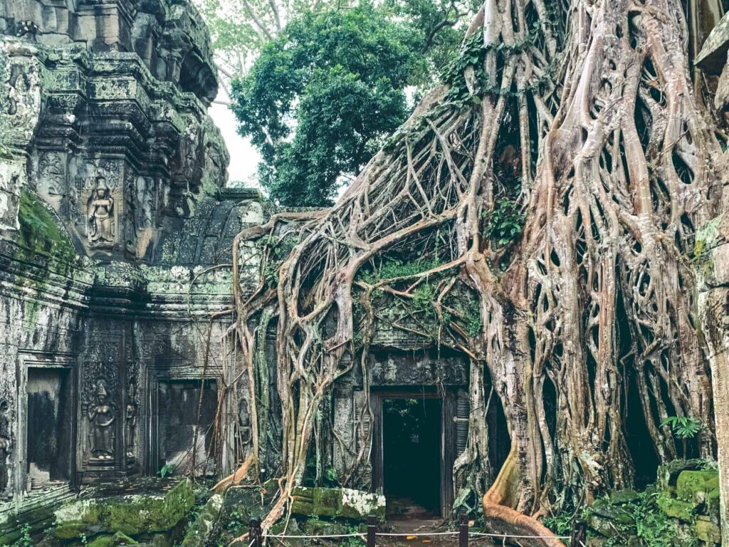 Mittagspause, nach drei Tempeln konnte man die auch gebrauchen bevor es zum nächsten, dem Ta Prohm Tempel ging. Hierbei handelt es sich um eine ehemalige Anlage, die in ihrem gesamten Gebäudekomplex sowohl einen Tempel, als auch ein Kloster, einige Nebengebäude und eine Maueranlage umfasst. Etwa zwei Kilometer von Angkor Wat entfernt gelegen ist Ta Prohm eine der berühmtesten Tempelanlagen Kambodschas, unter Anderem auch deshalb, weil dort 2001 die bekannten „Tomb Raider“ Verfilmungen gedreht wurden. Im Gegensatz zu vielen anderen Tempelanlagen der Region hat Ta Prohm keine aufwändigen Restaurationsarbeiten erfahren. Riesige zahlreichen Baumwurzeln umwuchern über die letzten Jahrhunderte hinweg den Tempel, somit ist es eigentlich ein architektonisches Wunder, dass der Tempel nach wie vor noch einigermaßen erkenn- und begehbar ist, obwohl die Natur sich dort so ausgiebig und ungehindert ausgebreitet hat.