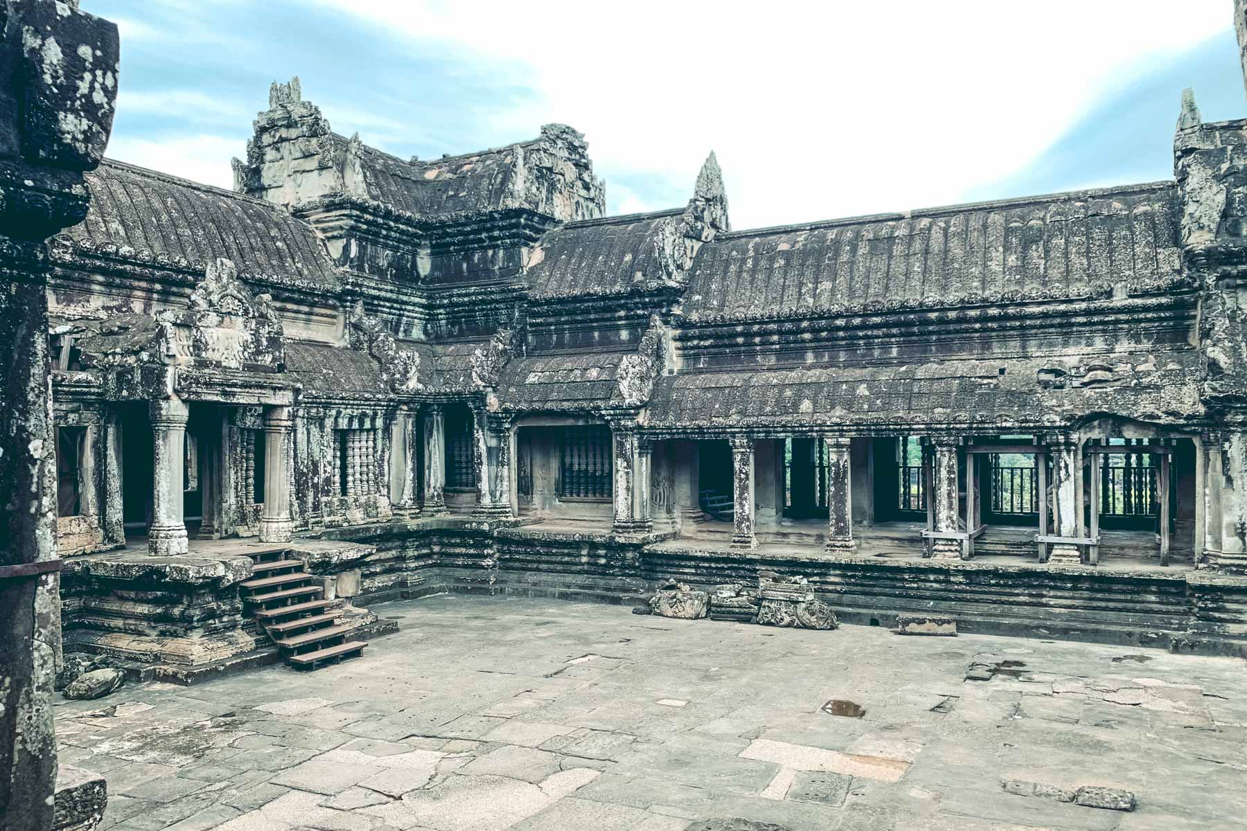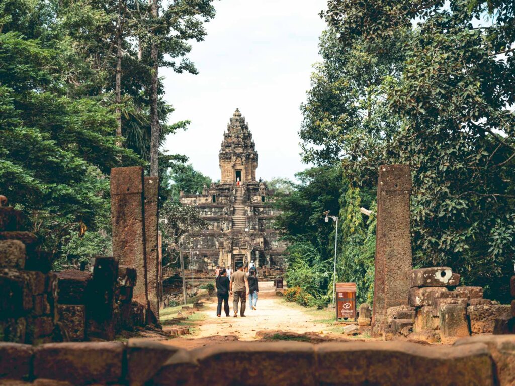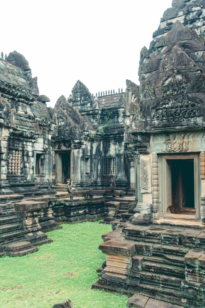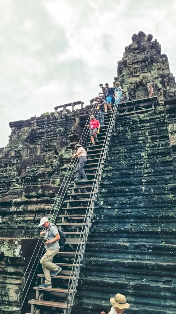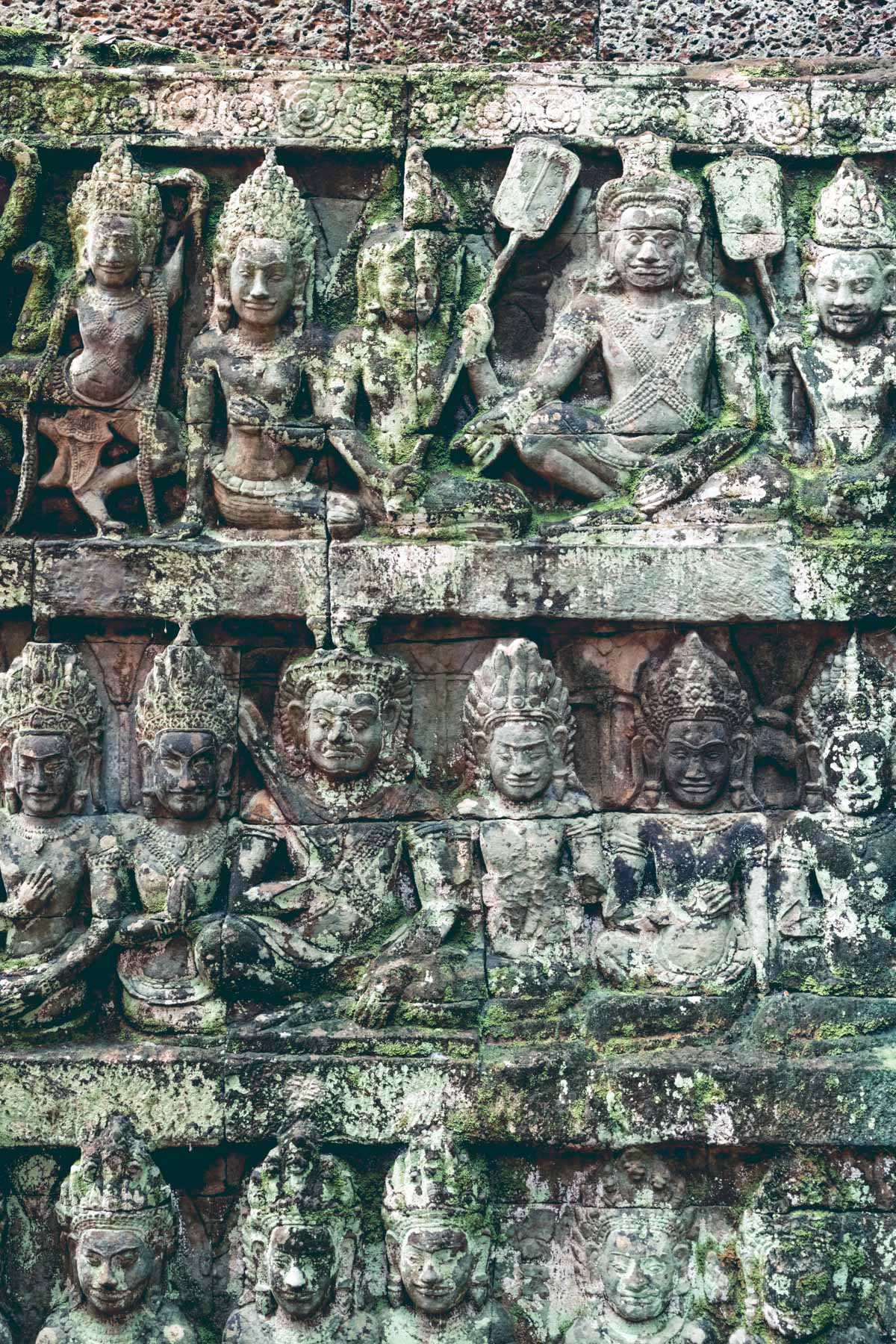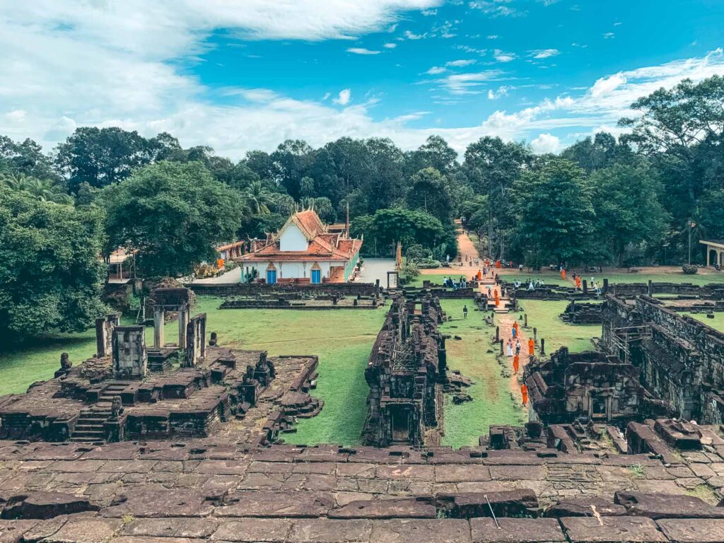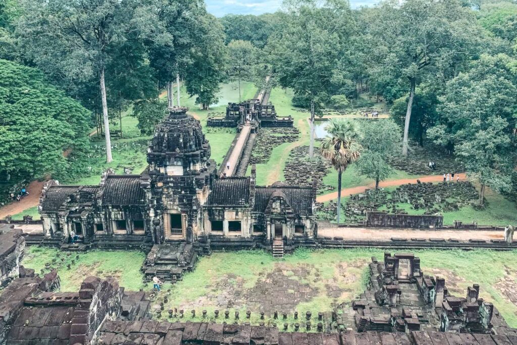 Am südlichen Ende der Anlage liegt der Baphuon Tempel, der monumentale Tempelberg wurde zu Ehren des Hindu-Gottes Shiva erbaut. Sein Turm überragt das umliegende Areal um etwa 30 Meter und bietet deshalb einen tollen Ausblick. Als Besonderheit lässt sich der etwa 170 Meter lange Steg bezeichnen, der den Weg zum inneren Pavillon und zum Tempelberg an sich ebnet. Zum Abschluss des Vormittags kamen wir noch zu zwei sehenswerten, detailreichen Terrassen – die Terrasse des Leprakönigs und die Elefantenterrasse.