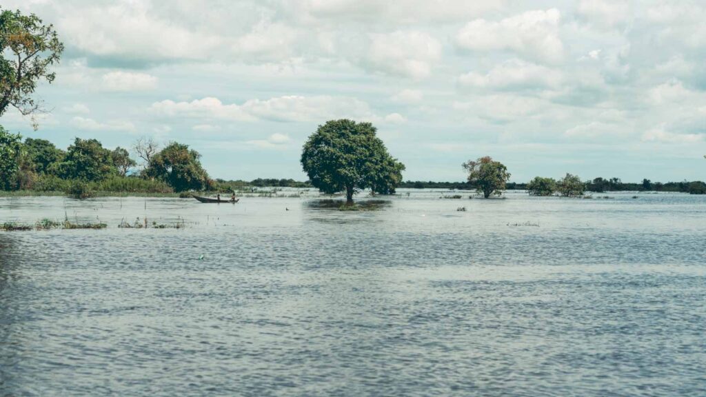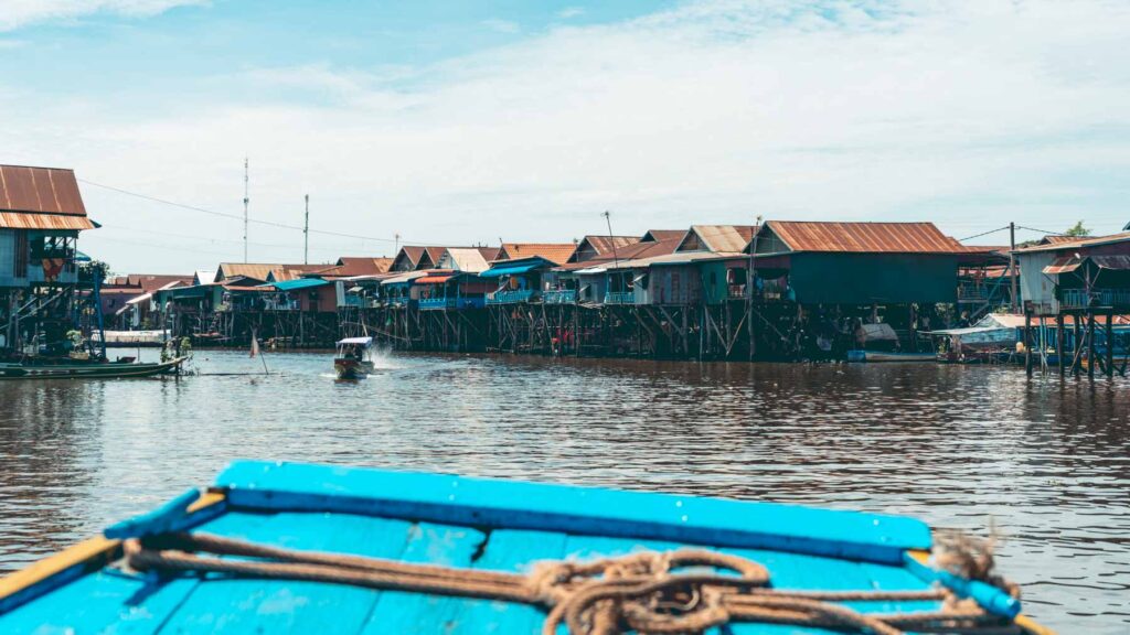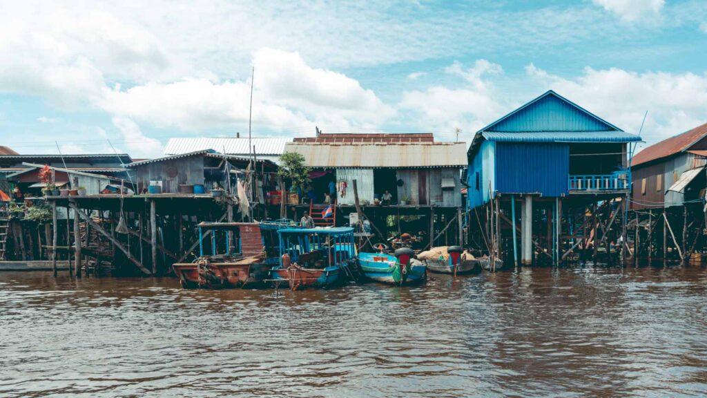 Der Tonle-Sap-See war ein weiteres Ausflugsziel am Vormittag. Ein weltweit einzigartiges Naturphänomen spielt sich hier jedes Jahr ab. Durch Schmelzwasser aus dem Himalaya und Monsunregenfälle ändert der Tonle-Sap-Fluss aufgrund des immensen Wasserdrucks seine Fließrichtung und füllt den See mit Wasser. Die Menschen hier haben ihre Lebensweise an die extrem schwankenden Wasserstände angepasst. Sie leben in Hausbooten, ihre Häuser schwimmen auf Bambusplattformen oder stehen auf Stelzen. Wir schauten uns das schwimmende Dorf Kampong Phluk an, wo knapp 4.000 Menschen, vorwiegend Khmer-Fischer, leben. In der Trockenzeit ragen die Stelzen der Häuser sechs bis sieben Meter aus dem Wasser, in der Regenzeit kann das Wasser die Türschwelle erreichen. In der Regenzeit fährt man daher per Boot durch die Kanäle und in der Trockenzeit schlendert man durch die Straßen des eindrucksvollen Ortes.