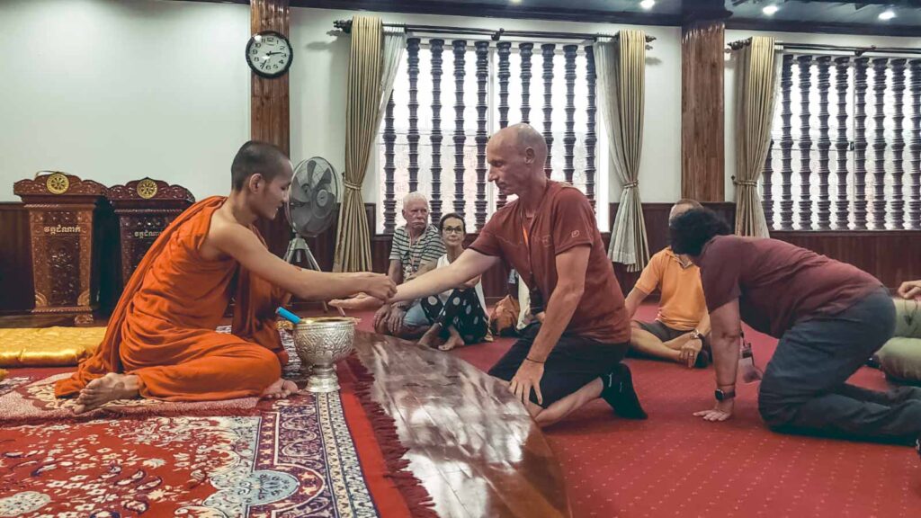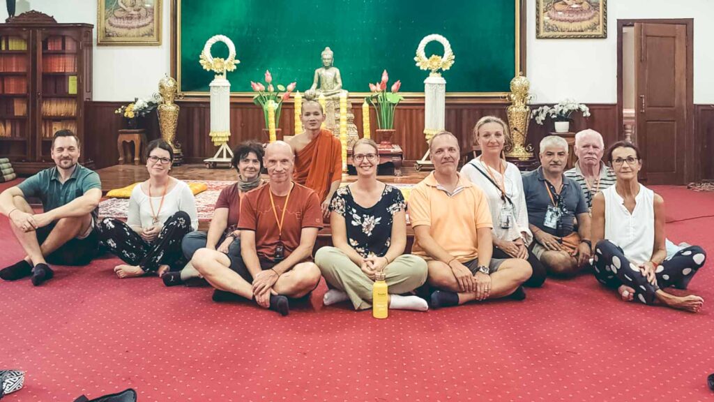 Unser Guide hatte noch eine kleine aber eindrucksvolle Überraschung für uns. Er brachte uns auf der Rückfahrt zum Hotel zu einem Kloster, wo ein Mönch sich für uns Zeit nahm um aus seinem Leben zu erzählen und Fragen zu beantworten. Anschliessend segnete er uns und jeder bekam ein Glücksarmband umgebunden.